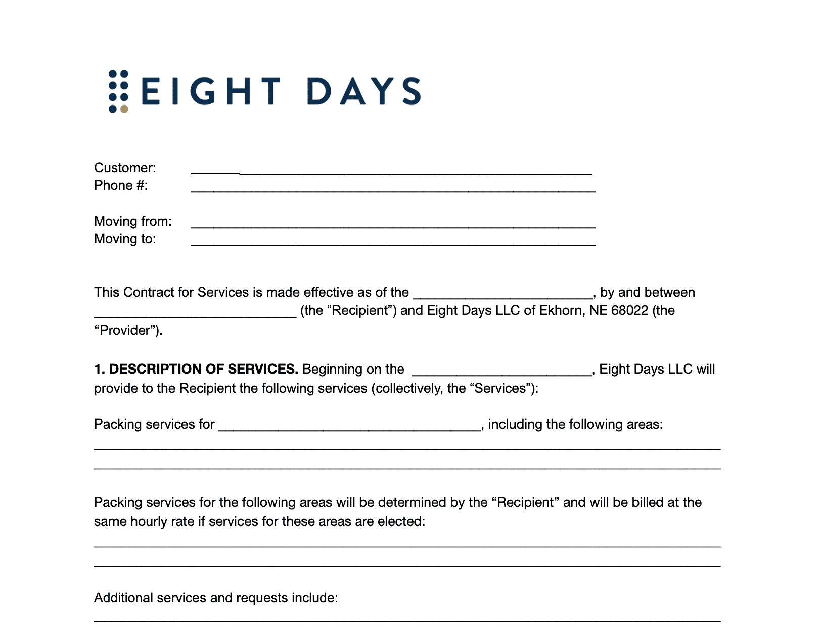 Eight Days will send out an updated version of this contract anytime updates are made. Below is the current Packing Services Contract.