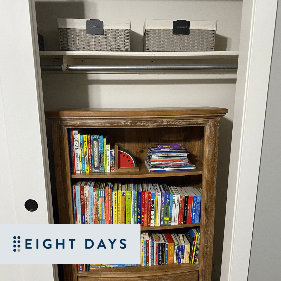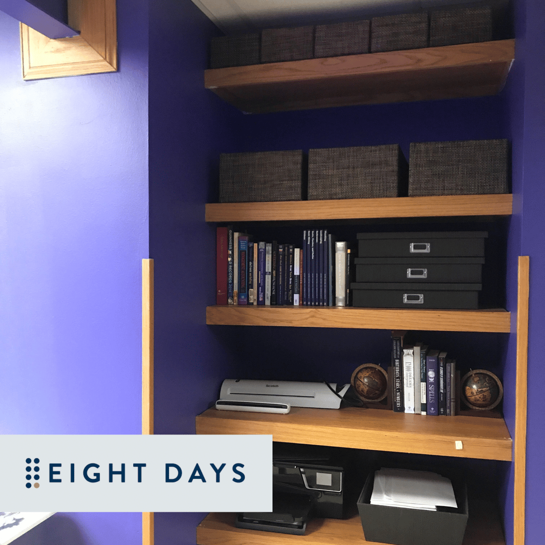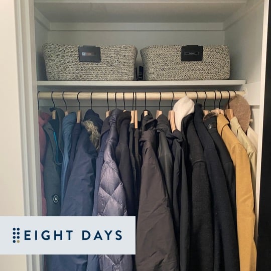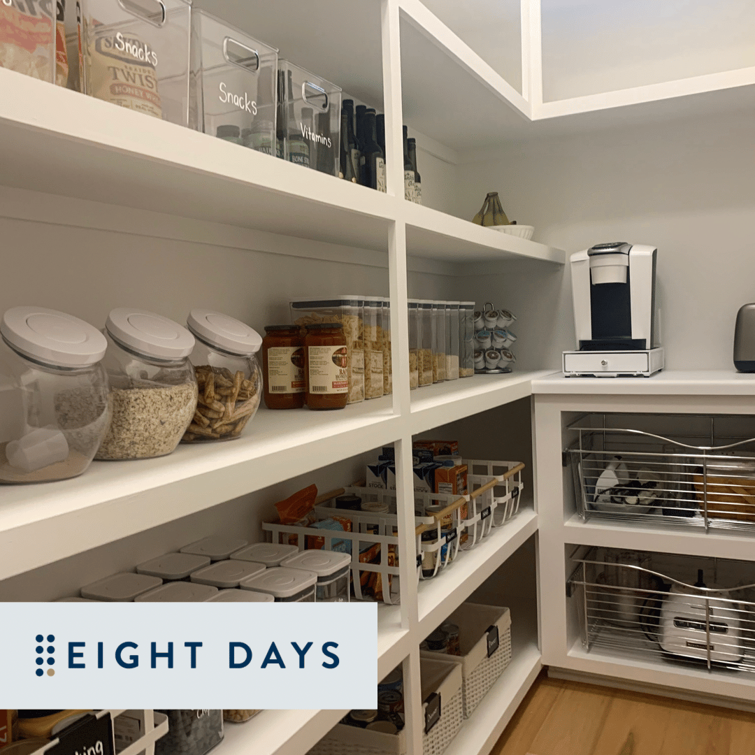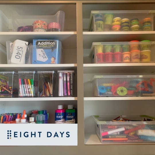 Bins up high make items easy to get down. This way, items don’t get lost on the back of the shelf. Labels on these bins are often important so you know what is way up there at a glance.