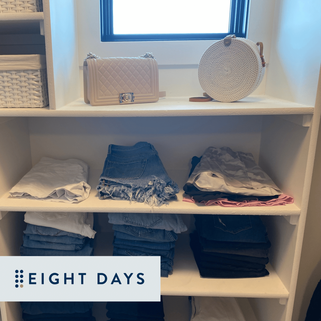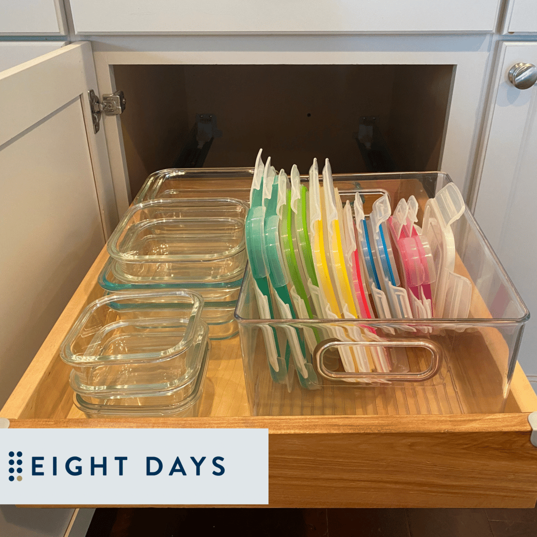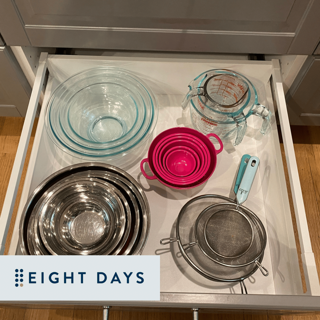 Every drawer and cabinet should not be packed full. We love clear space at Eight Days! Clear space can be accomplished by encouraging clients to do the following: