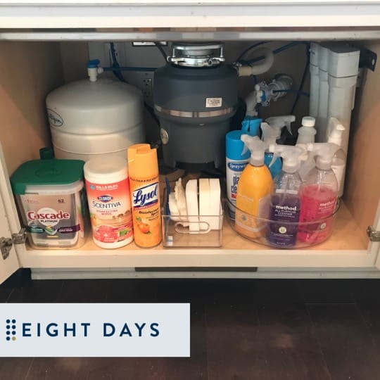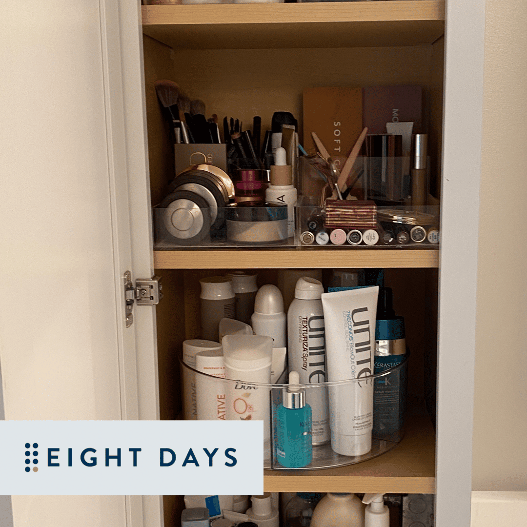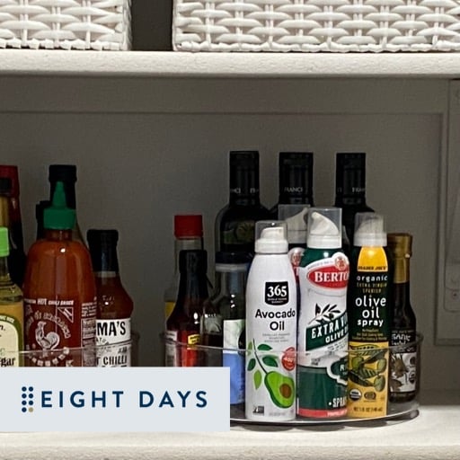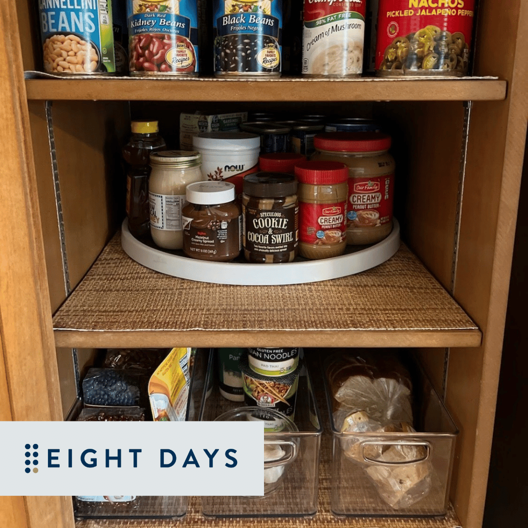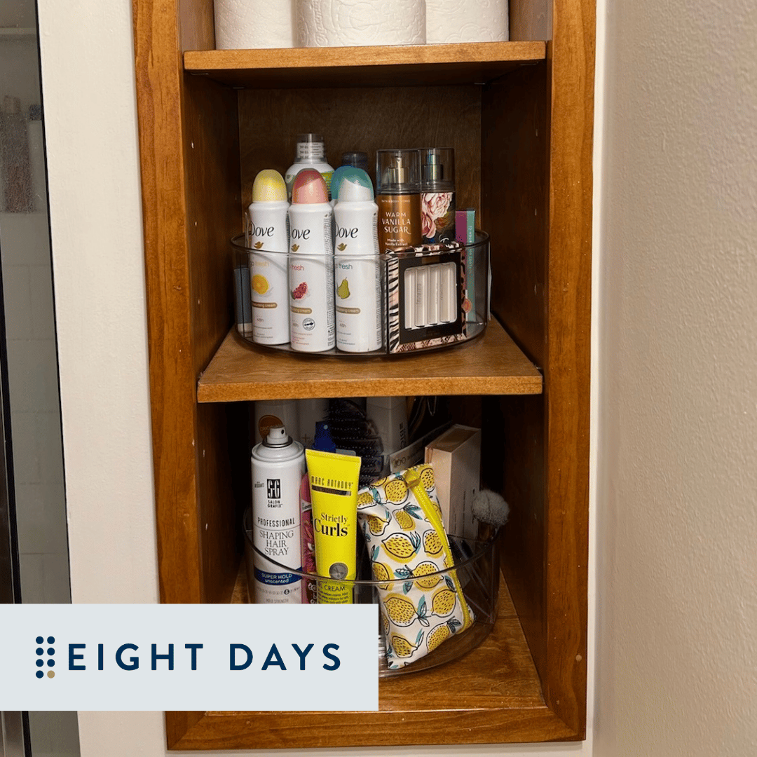 Turntables allow us to maximize space and organization. The spinning function allows clients to easily get to items without having to move things out of the way. We like to use turntables in bathrooms for hair products, makeup products, and medications. We also like to use them in the pantry for condiments, spices, oils and vinegars.