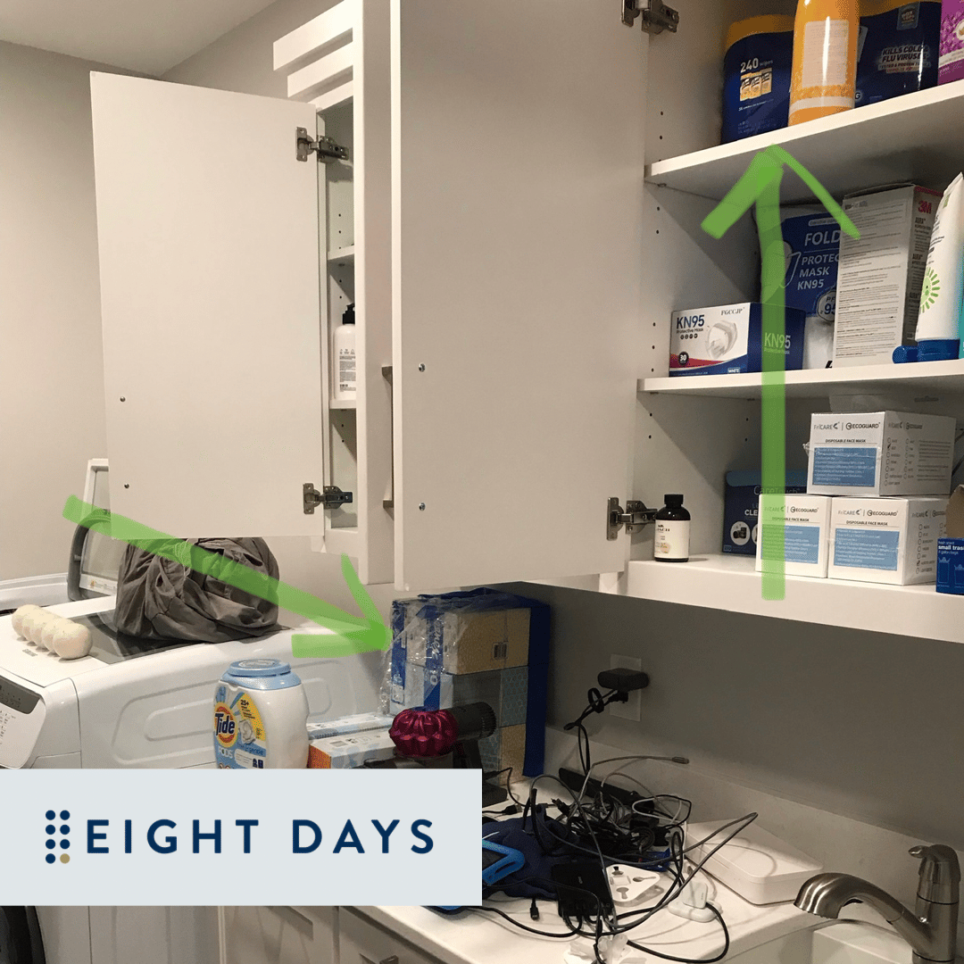 At Eight Days, we like to unwrap all back stock items before organizing if they are in containers or plastic. It is easier to organize these unwrapped because they can be lined up in more configurations and fit in more spaces instead of taking up an entire shelf. Let the items sit on the shelf or let the containers contain them instead of a bunch of wrapping.