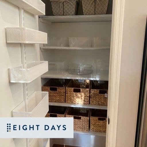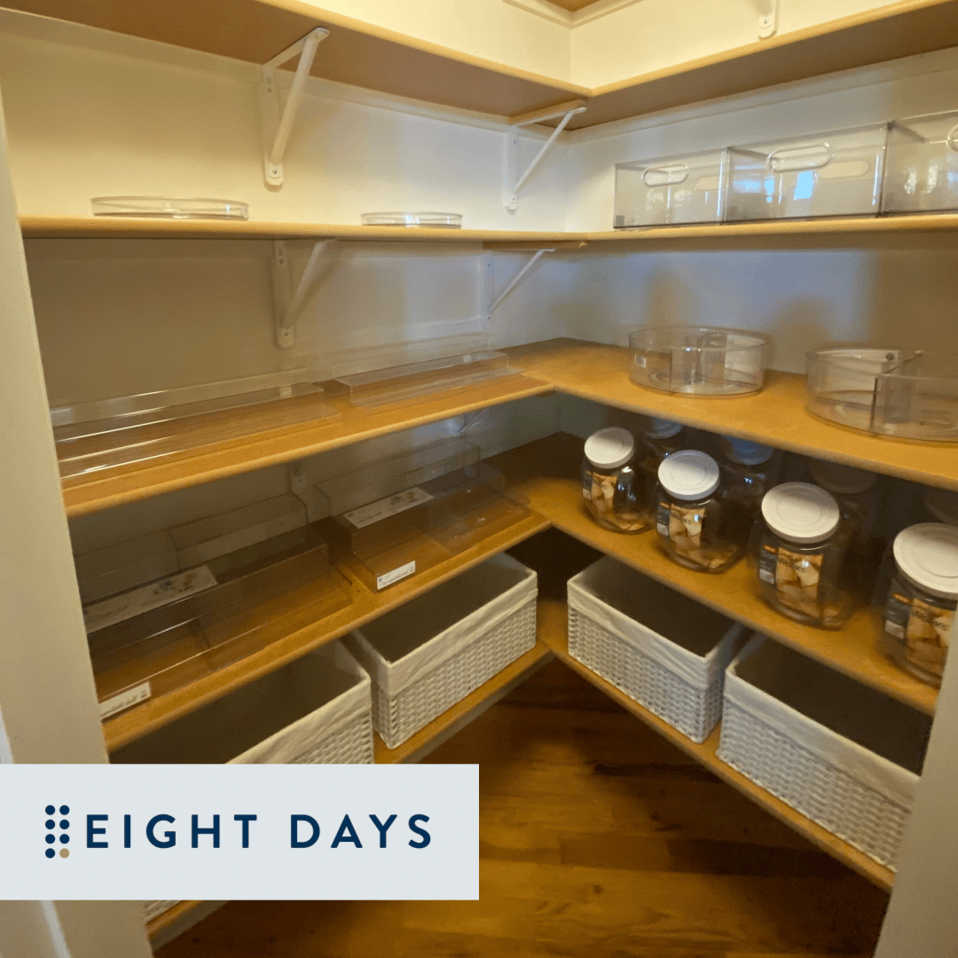 When we get to a project we always empty out a space and organize into categories. This gives us an opportunity to assess the things that should go back into the pantry and where they need to be put. We call this Marking up a photo to plan a space and get approval from the Eight Days Office to carry out and complete the project.